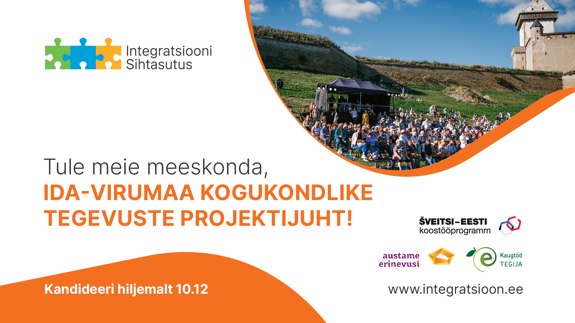 Kandideerimine: Ootame sinu CV-d ja motivatsioonikirja hiljemalt 10. detsembriks 2024 e-posti aadressile kandideeri@integratsioon.ee märksõnaga „Ida-Virumaa kogukondlike tegevuste projektijuht“. Motivatsioonikirjas palume sul avada, kuidas sinu varasemad kogemused toetavad lõimumist edendavate kogukondlike tegevuste elluviimist. Oleme huvitatud ka sinu visioonist, kuidas kaasata Ida-Virumaa kogukondi aktiivselt ühiskondlikku ellu.